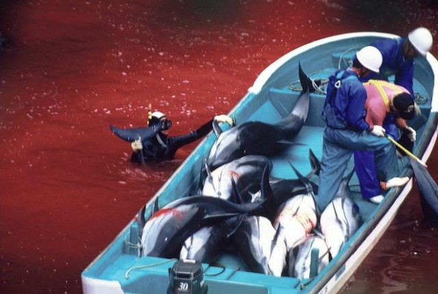 瑞察因为海豚的这个习性,难过得几乎抓光了自己的头发。大屠杀几个小时后,海湾的潮水依然是血红的。