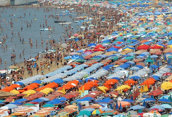 阿尔巴尼亚的都拉斯海滩,地中海周围的海滩在全世界都非常有名。专家们认为这种知名度带来了灾难性后果,因为人越多意味着污染越多。对于海底奇珍越来越大的需求以及随之而来的对鱼类的过度捕捞,对海洋物种的数量产生了毁灭性影响。