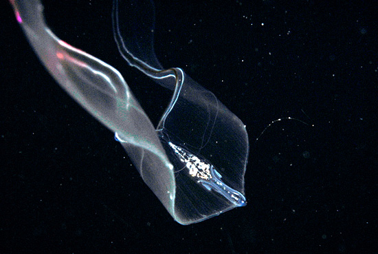 这是栉水母门Thalassocalycida目的Thalassocalyce inconstans。它们生长于海面或浅海水域,活动范围包括大西洋和地中海,有时还包括太平洋暖流靠岸后的中部加利福尼亚的海域。 图中的它正在张开宽大的钟型身体捕捉猎物。