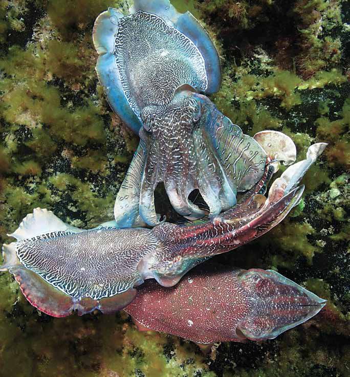 Whyalla,一个沿海城市,是大乌贼的生命起始点。这个地方很容易到达,在5到15英尺的水中(55到60度)见证他们的最后的时光,庆祝生命的诞生必须以死亡告终。尽管体型是超大号的——雄性达到近3英尺长——与典型的鱿鱼堂兄弟相比,这些乌贼的命很短,没有一个年龄超过18个月,但这是他们的轮回。雄性努力让雌性关注它们,并将情敌打败,闪烁的颜色和支撑着触须是他们求爱的仪式和竞争方式,最终将获得一个交配的机会,面对面的将触角仅仅抱在一起。