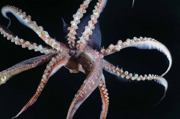 向前游动,收紧你的下巴。一个新的猎食能手,美洲大赤鱿就要出现了——又名aka Red Devils——主要在热带东太平洋的深海珊瑚礁中。鱿鱼须只要18个月就能长到6英尺长,完全不用奇怪,因为大赤鱿似乎除了吃就是吃。一项研究显示,这些自相残杀的食肉动物,只要轻微碰撞就会高兴地吞噬彼此,瞧这暴脾气!幸运的是,他们对潜水员显得很被动。在科特斯海北部海域,船宿的强光在夜晚中吸引来大量的大赤鱿。