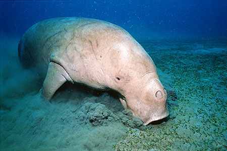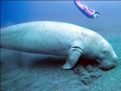 儒艮。它们跟海牛是亲戚的海洋生物,一定要在5分钟左右探个头,呼吸点新鲜空气。在从东非到澳洲的海岸水域,这种行为和它们典型的动作迟缓的特质,也使它们很容易被需要它们的肉,油和牙齿猎人锁定。