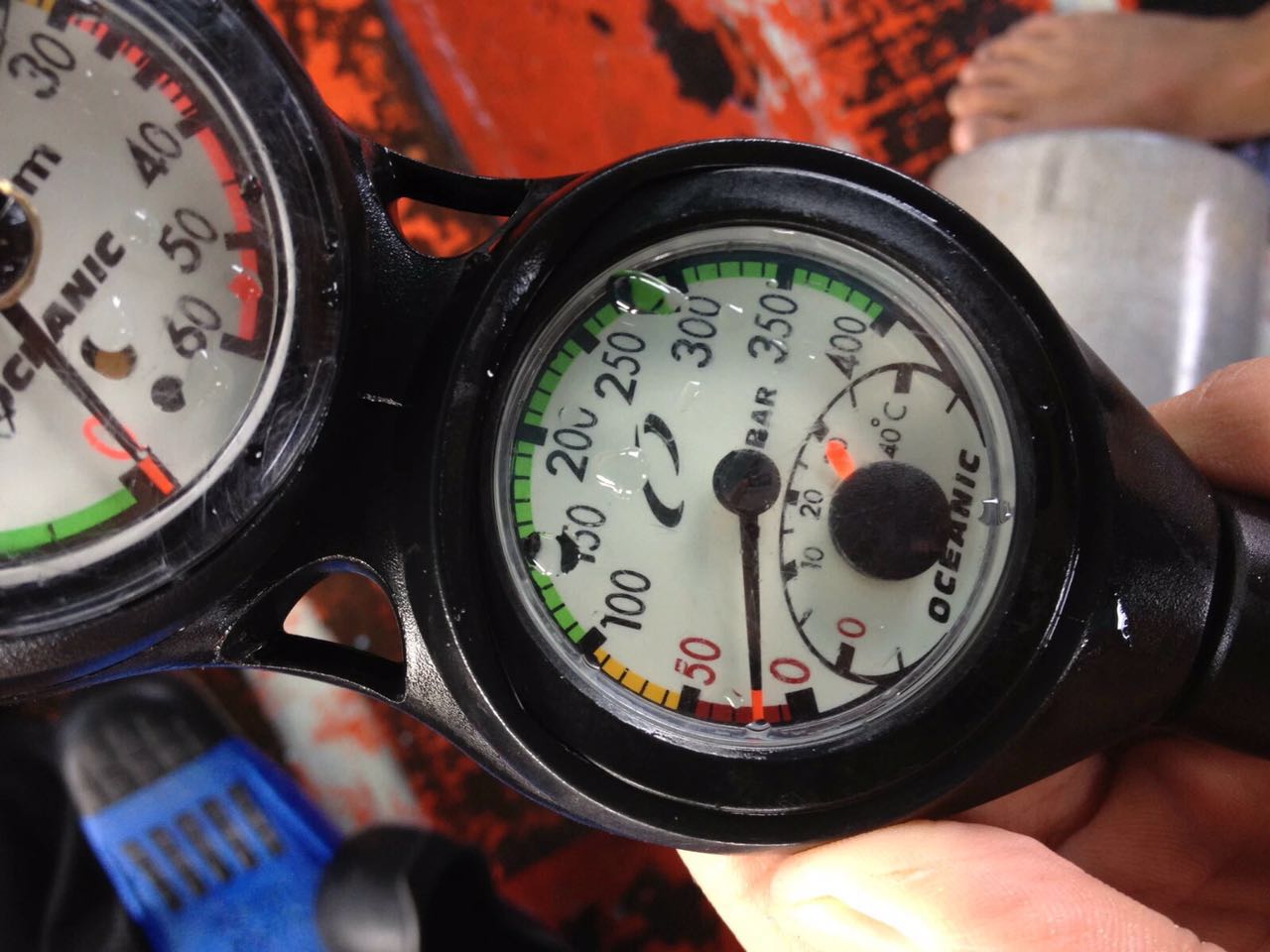 潜水时气瓶没有空气是最要命的危急情况,一般是剩下70bar气的时候准备上升,剩下50bar气的时候直接上升。下潜越深,海水压力越大,相应的我们呼吸的空气压力也越大,耗气也快,身体吸收氮气越多,所能停留的时间越短。