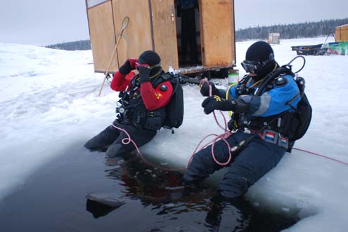 北方冬天的气温通常低于 0°C,甚至达到-10°C 以下,这个温度比没有结冰的海水还要低很多。因此千万不要在水面使用呼吸器呼吸,一定要等一级头泡在水里之后再使用呼吸器,否则会被冻住。如果水温很低,比如低于 0°C (32°F),一定要将VIVA悬钮放在“MIN”或者“PREDIVE”位置,以防止二级头意外跑气。冰潜时一定要避免耗气量高的动作,比如同时给干衣和BCD充气,使用备用二级头等,此外尽量不要用按二级头进气阀的方法来测试二级头。这些动作都会增加空气流量,容易导致一级头出气口结冰。