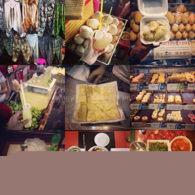 ▲在考山路你能吃到到上图各种当地小食,以及买到当地花裤子;晚上9点乘坐大巴等待第二天6点到达码头