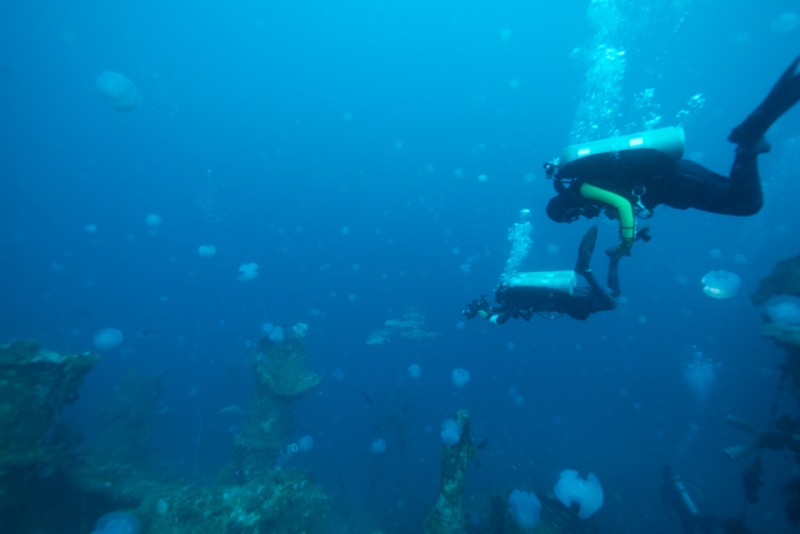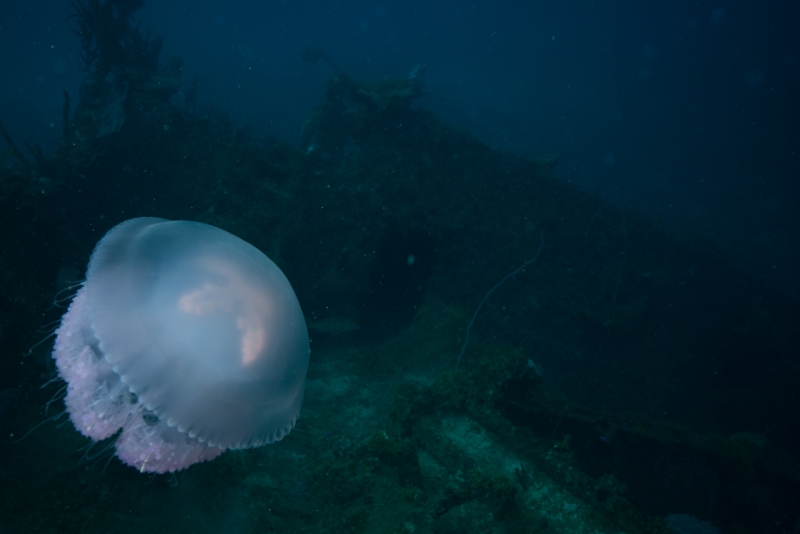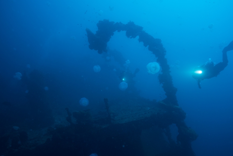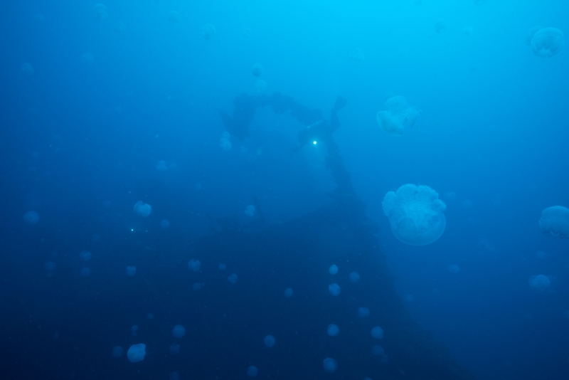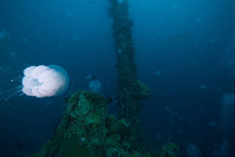 日本丸深度为30-50米。这一潜遇上了我在水下最害怕的东西:水母。到处都是水母,简直在水母汤里完成了潜水……