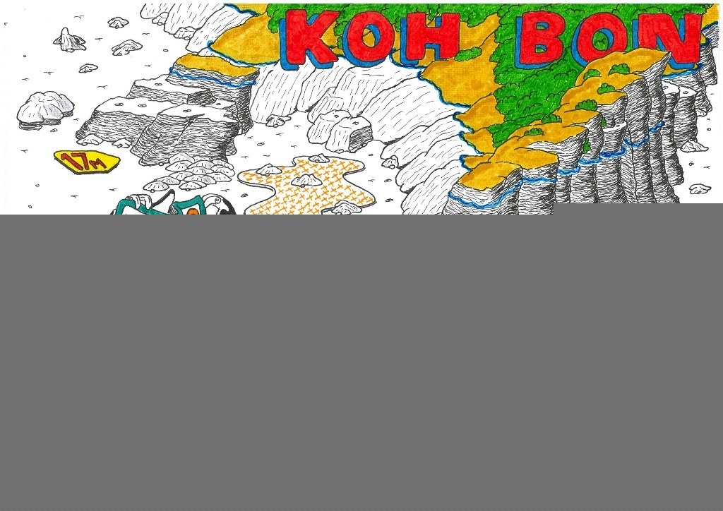 Koh bon这个词在泰语里翻译过来是“有窗户的岛”,在小岛靠近海绵的地方有一个长年累月被海浪冲刷出的一个大洞,看起来就像窗户一般。在方向正确的时候能够从窗户的一侧看到另外一侧远处的Koh tachai。潜点位于小岛西面角落,是岛屿山脊的水下延伸部分。南侧为垂直的峭壁,北侧则为略平缓的死珊瑚区。船长会根据水流的走向来决定入水的地点,大部分都是南北横向流,入水点一般会选择在峭壁一侧,往西沿着水下山脊可以走到30米或者更深的地方。这里是一个清洁站,也是斯米兰最有名的看manta的潜点。流大但不乱,山脊两边都可以找到地方躲避水流,经常会有manta出没在此处,它们会从深海沿着山脊往上游到20米左右在那里游弋,潜水员们通常也会花上一些时间在20到25米处等待这些庞然大物的来临。小锅在这个潜点同时看到四只巨无霸黑武士转悠,只能用震撼两个字形容当时的心情。建议使用高氧,效果你懂的。