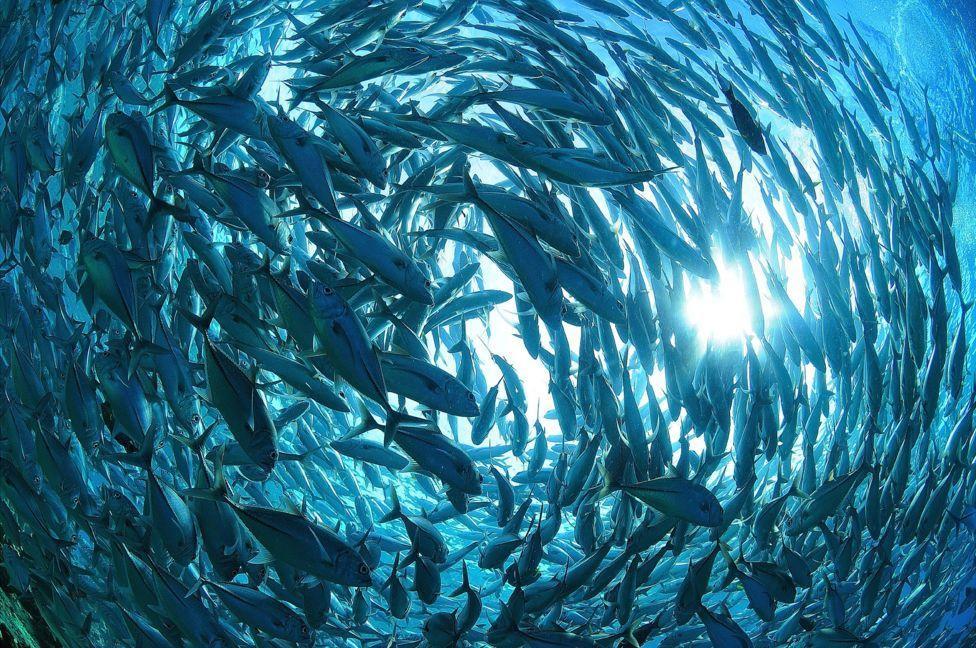 大眼鲷(Bigeye Trevally)成群游过,画面壮观。