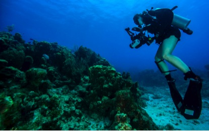 为了强调前景,背景可以欠曝约一挡左右。调整好闪光灯,确保潜水员的脸部被照亮,并确定他或她正在观察既定的事物而不是在盯着你的镜头。