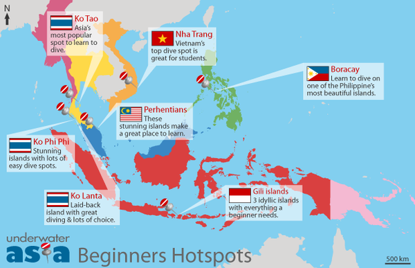 OK,在理清自己需求之前,我们不妨先来看看学习潜水的热门地点。说到热门的学习潜水目的地,这其实包含了另外一层意思,就是热门的中文潜水学校(潜店)。潜水的中文市场,是近几年才开始快速发展、扩大的,目前热门的目的地为马来西亚(33%)、中国(24%)、菲律宾(21%)、泰国(19%)、印尼(2%)。这里可能小伙伴们要跌眼镜,中国排在第二位?没错,这个是2013年PADI入门级课程的数据,说明国内的潜水业者也是蛮拼的。先谈国内,海南岛是近水楼台的角色,北京、上海、广州、深圳一些俱乐部是PADI中国区的主要合作伙伴,同时内陆也百花齐放,云南、四川、重庆、广西等地区也在努力发展。再看国外就主要集中在东南亚:泰国涛岛,马来西亚仙本那,菲律宾薄荷、宿务、PG(PuertoGalera海豚湾),印尼巴厘岛更是大热中的焦点;放眼稍远的地方,也会有中文课程,例如帕劳、斐济、马尔代夫。以上就是中文课程的分布情况,在家门口学习的不算少数,东南亚是老牌劲旅,高大上目的地花假期学习就是有钱任性。
