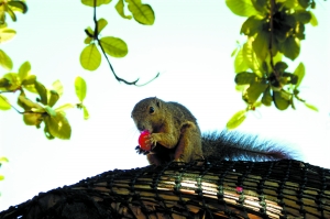 从广州到热浪岛,中途要转机,一路上车途劳累。但是,当“断尾鱼”来到热浪岛的酒店时,疲惫的身心迅速被一只小松鼠彻底的解放了。它手捧果子,打量着初来乍到的访客,亮晶晶的眼睛似充满好奇。大家朝它欢乐地打招呼,纷纷举起手中相机。它却淡定地继续享受手中美味,颇有见惯大场面的风度,过一会才跳跃着离去……