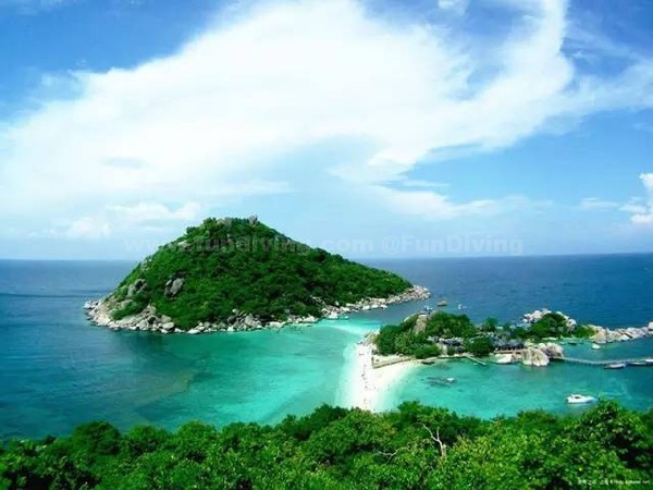 南园岛位于泰国海湾,包括三个小岛,由一片洁白的人字形沙滩连接而成,当海水落潮时,三座小岛便连成一体,走在狭长的沙滩上,左边是海,右边也是海。