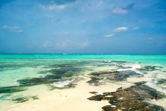 岛上全是细软的白色海沙,混着被吹打碎的红珊瑚粉末,水清沙幼。而这里的海水像钻石一样晶莹透亮,仅凭肉眼便能看到海底的景象。